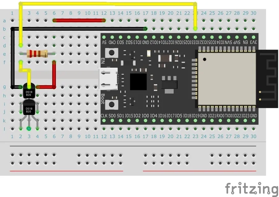 DS18B20は複数つなぐことができます。以下のように2つのセンサーを並列につないでみます。