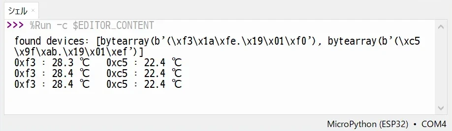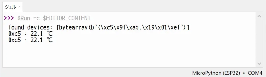 実行ボタンを押すか、[F5]キーで実行すると、「シェル」ウインドウに温度が表示されます。正常に動作しているか確かめるには、手でセンサーに触れてみると良いです。温度が上がるはずです。