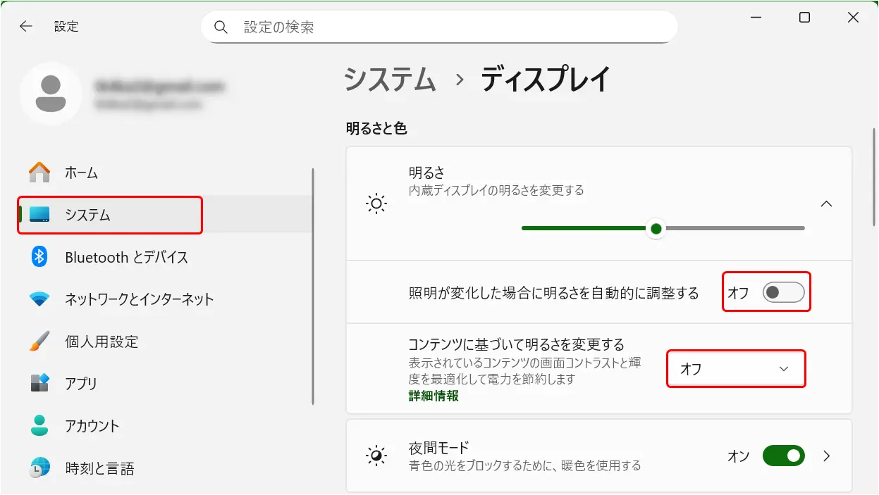 - 「明るさ」を開き、「照明が変化した場合に明るさを自動的に調整する」「コンテンツに基づいて明るさを変更する」をオフに